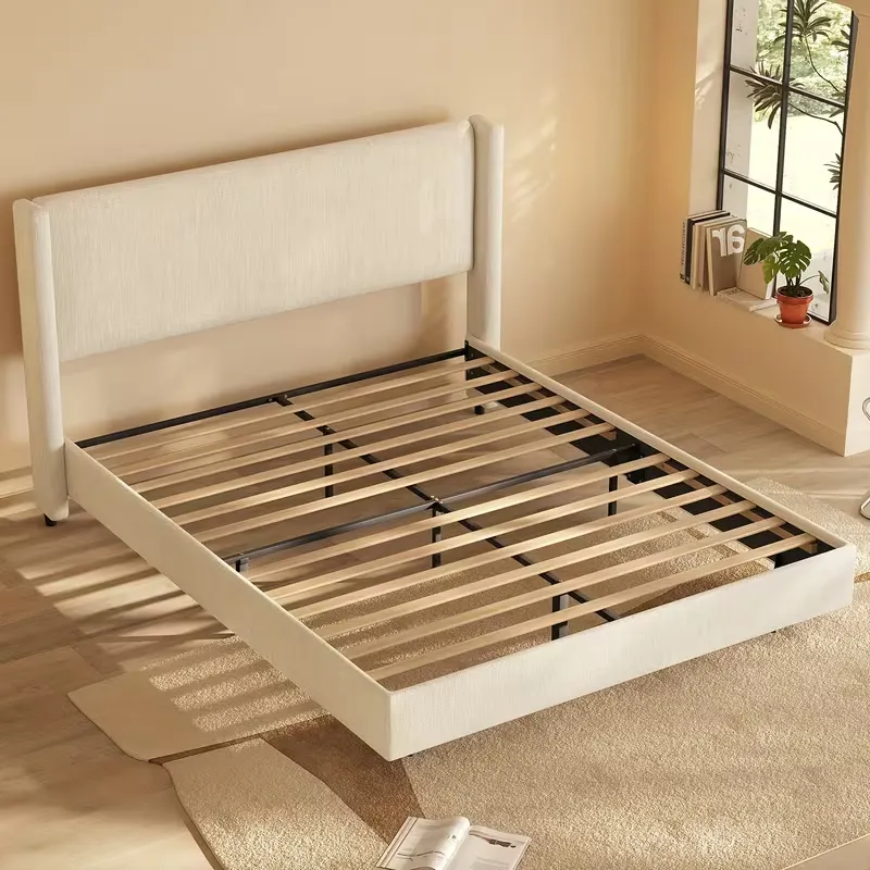 This modern bed frame features a stylish wingback headboard and nine support legs for stability. Noise-free and no box spring required, it offers contemporary design, easy assembly, and durable support for queen-size bedrooms.